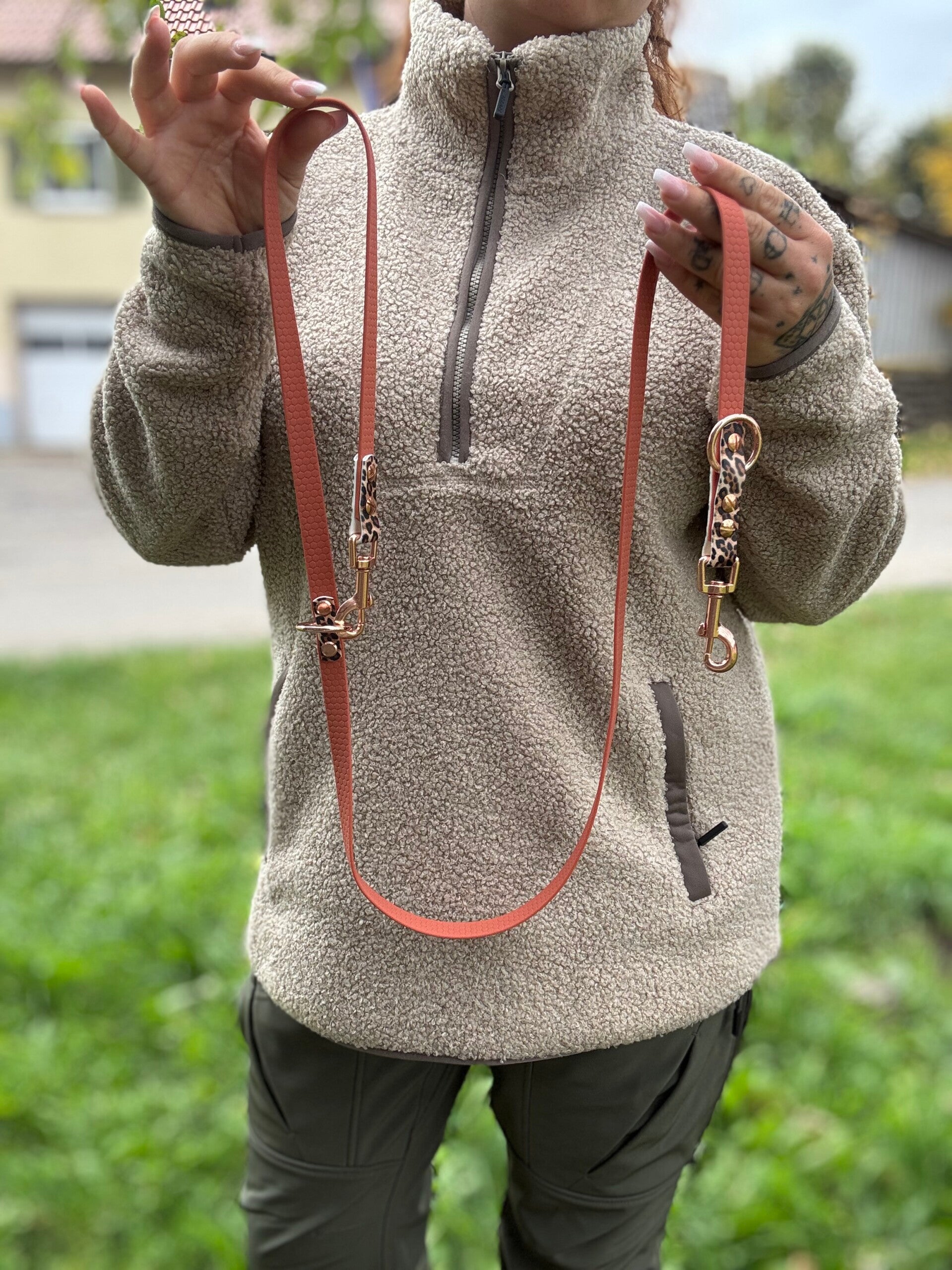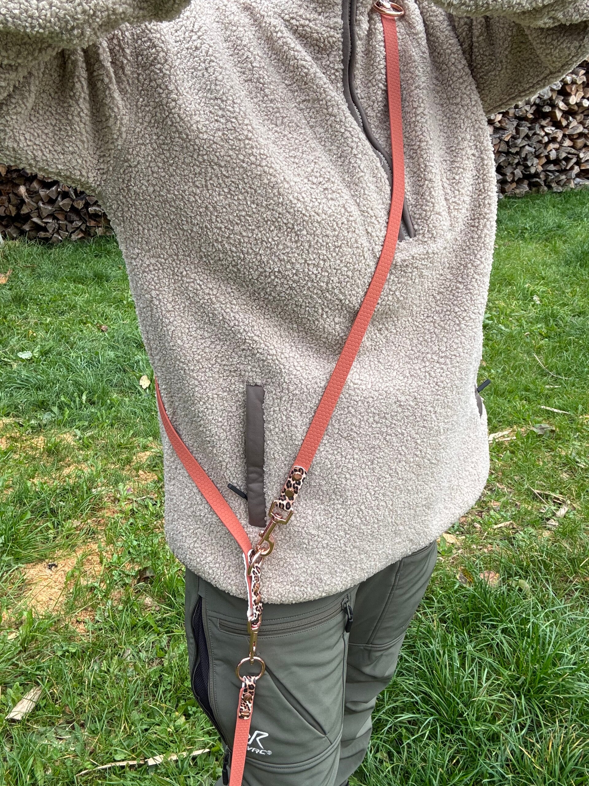 Dieses zweite Stück lässt sich direkt am Halsband oder Geschirr befestigen und auch als kurze Schleppleine verwenden. Besonders praktisch: An der Crossbody-Leine kannst du zwei Hunde gleichzeitig führen – die drehbaren Karabiner verhindern zuverlässig, dass sich die Leinen verheddern.